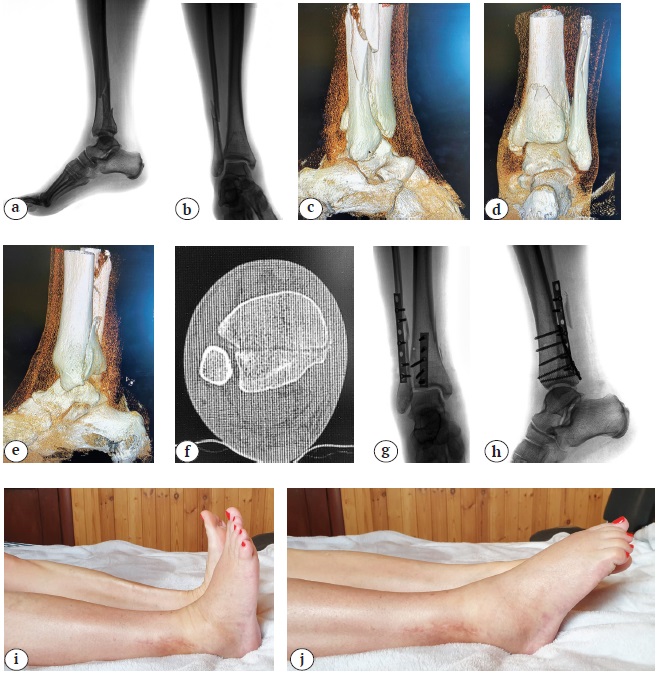4. Fig. 3. Surgical treatment of a patient with a fracture 44C2.3: a, b — primary X-rays in AP and lateral projections; c, d, e, f — CT data showing the size of the posterior edge of the tibia; g, h — postoperative X-rays in AP and lateral projections — anatomical reposition of bone fragments in the ankle joint; i, j — functional result of treatment 48 weeks after injury