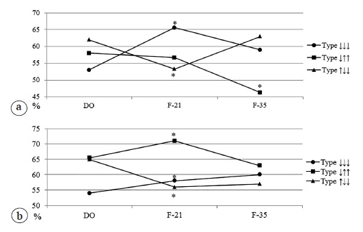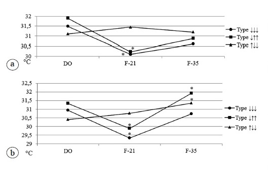 Fig. 1. Dynamics of changes in the soft tissues temperature in the projection of bone trauma at the fixation stage with different variants of blood flow: a — 1st series; b — 2nd series; * — p>0.05. Hereafter: DO – before surgery; F-21 – fixation 21 days; F-35 – fixation 35 days