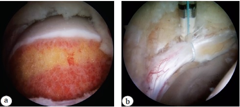 The first stage consisted of arthroscopic correction of intraarticular damages without joint distraction. Modelling resection of femoral head and neck deformity was performed. The state of articular labrum, acetabulum and femoral neck cartilage was evaluated after joint distraction. In case of full-thickness labrum damage the latter was sutured with the use of anchors (Fig. 1).