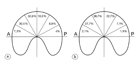 Characteristics of identified acetabular labrum damages, performed procedures as well as cartilage lesions are shown in the Table 4. Most often, articular labrum damage and acetabular cartilage lesion were localized in anterosuperior region (Fig. 2).