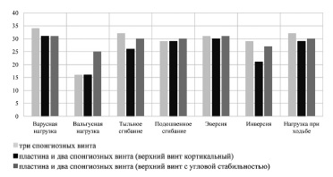 As for the contact pressure at the boarder of the tibia and the talar bone, its maximum values were observed in case of varus load in all ankle fixation variants. It was equal to 34 MPa in the first fixation variant and 31 MPa – in the second and the third ones. The model of ankle joint fixation with the plate and two cancellous screws showed slightly better biomechanical properties under the majority of load types. It should be noted, that excessive contact pressure under the load is a negative factor, as it can lead to local osteolysis and loss of correct position of ankylosed bones.