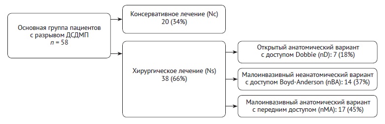 Indications for surgical treatment were the presence of a characteristic trauma in the anamnesis, at least two positive targeted clinical tests (Ruland, O'Driscoll, comparative kinetic test DC-100) and DBT rupture, confirmed by one or more instrumental diagnostic methods.