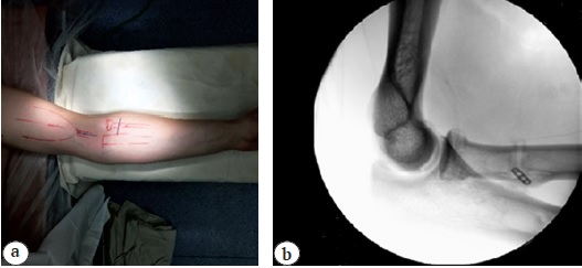 Fig. 4. Patient 41 y.o., Ns group, nMA: a — planning of surgical approach; b — intraoperative X-ray control