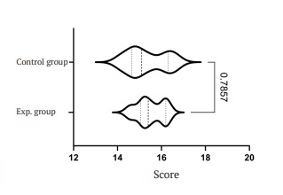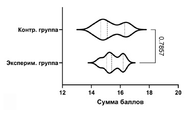 Fig. 2. Statistical characteristics of the scores in the groups on the 2nd day. Note: The vertical bold dotted line the median line on the graph, the normal dotted line indicates the 25th and 75th percentiles. The curves of the outer lines which form shapes at the graph, show the distribution of cases in the group