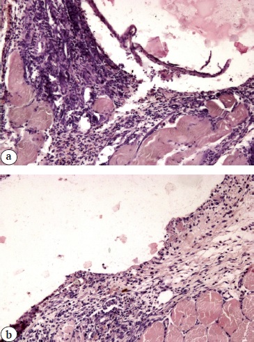 Fig. 5. Pathohistological picture at the site of implantation on the 7th day: a — in the control group; b — in the experimental group. Stained with hematoxylin and eosin. Mag. ×200