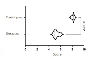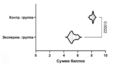 There was a moderately pronounced line of immature connective tissue in the experimental group with small (4 to 7 in the field of vision) groups of proliferating newly-formed capillaries and areas of minimal necrosis in the place of contact with the implant. Polymorphocellular lymphocytes infiltrated the newly-formed stroma in small groups of cells from 5 to 12 in the field of vision. Lymphocytes were presented as a diffuse abundant infiltrate. Plasma cells, macrophages and multinucleated giant cells were represented by weakly pronounced focal infiltrates similar to those in the control group, predominantly located along the newly-formed connective tissue (Fig. 3 b). The comparison of total scores revealed statistically significant differences (р = 0.0022) (Fig. 4).