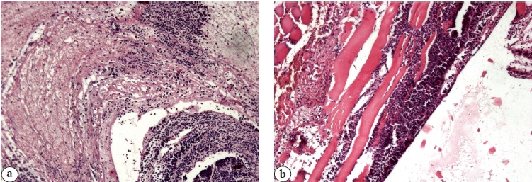 Fig. 1. Pathohistological picture at the site of implantation on the 2nd day: a — in the control group; b — in the experimental group. Stained with hematoxylin and eosin. Mag. ×200