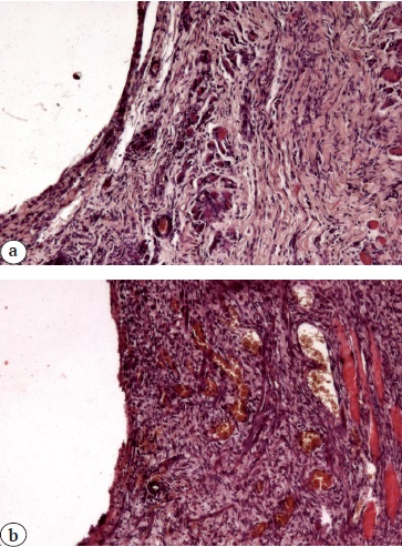 On the 4th day, the control group showed a thick line of immature connective tissue with separate groups of proliferating newly-formed vessels and mild necrotic changes in the areas of direct contact with the implanted wire (Fig. 3 a). Polymorphocellular leukocytes were presented as small dense infiltrates. Lymphocytes infiltrated immature connective tissue forming diffuse abundant clusters. Plasma cells, macrophages and multinucleated giant cells formed single marked infiltrates of newly-formed stroma, predominantly locating along the newly-formed connective tissue.
