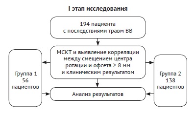 To verify the hypothesis, all patients were divided into two groups at the stage I of the study. Group allocation was performed depending on the degree of restoration of such parameters as triplane displacement of the center of rotation and femoral offset of the operated joint in comparison to the contralateral joint (Fig. 1).