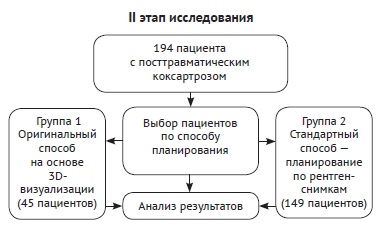 During the stage I of the study we developed the method that allowed to determine surgical tactics of acetabular component implantation of total prosthesis. Stage II of our study was carried out to analyze the method efficacy. Patients were divided into two groups. Group 1 included 45 patients who underwent preoperative planning between 2020 and 2022 with the application of suggested method. Surgical tactics was chosen according to this method as well. Group 2 (control group) included 149 patients who underwent conventional preoperative planning (plane templates, virtual planning program) between 2014 and 2019 (Fig. 2). Gender and age characteristics are presented in the Table 2.