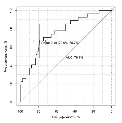 Fig. 3. Receiver operating characteristic (ROC) curve (threshold value 17.9). Automatic multifactorial optimal predictive model of complications