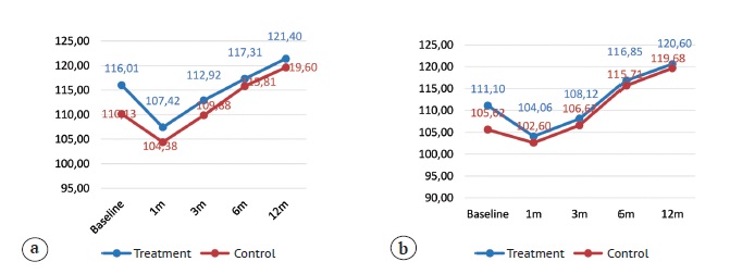 Fig. 1. Passive (a) and active (b) knee flexion for treatment and control groups at different follow-up