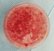 С целью минимизации объема оперативного вмешательства использовали единичный небольшой хирургический доступ по дорсальной поверхности шеи животного, паравертебрально между лопатками и параллельно линии остистых отростков позвонков и осуществляли забор жировой ткани кремово-белого цвета в объеме 2 мл. Именно для этой локализации у взрослых особей кроликов характерно наибольшее количество светло-коричневых жировых клеток (Beige AT), схожих по свойствам с хорошо васкуляризированной бурой жировой тканью [11]. Согласно принципам современной физиологии, у человека при выполнении операций с использованием стромально-васкулярной фракции жировой ткани забор жировой ткани осуществляется из аналогичных анатомических областей тела и параумбиликальной зоны [12]. Полученную жировую ткань укладывали в стерильную чашку Петри с добавлением 4 мл раствора Кляйна (оригинального состава) с последующим измельчением (рис. 1).