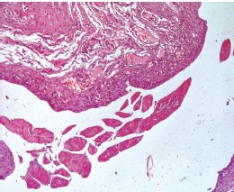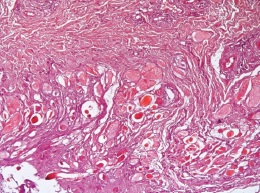 Рис. 3. Фрагмент кожи кролика линии NZW, 2-я нед. исследования: в просвете соединительнотканной капсулы сохранены фрагменты зрелой костной ткани имплантированных костных матриц; слабая инфильтрация стенок соединительнотканной капсулы макрофагами и мононуклеарными лейкоцитами; большое количество мелких полнокровных тонкостенных кровеносных сосудов между волокнами соединительной ткани. Окраска гематоксилином и эозином. Ув. ×100