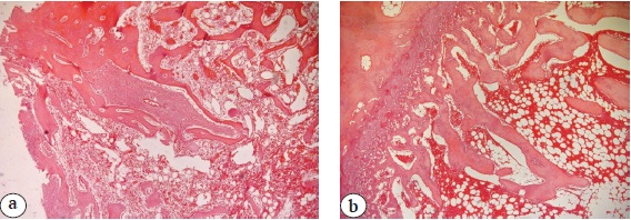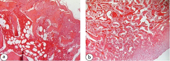 Рис. 5. Фрагмент костной ткани бедренной кости кролика линии NZW, область костного дефекта: a — 2-я нед. исследования; b — 6-я нед. исследования. Окраска гематоксилином и эозином. Ув. ×100