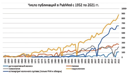 Часто на конференциях можно увидеть следующий прием: авторы, обосновывая актуальность изучаемой темы, приводят как доказательство увеличивающееся число публикаций по теме. По любой теме. При этом на слайде демонстрируется красивый график числа публикаций по годам в PubMed, устремленный ввысь. К сожалению, этот рост числа публикаций обусловлен не актуальностью, а просто ростом числа публикаций в целом. Чтобы убедиться в этом, достаточно задать любой ключ поиска: будь то дегенеративный мениск, надколенник, остеоартрит коленного сустава, пиявки или гомеопатия (рис. 1).