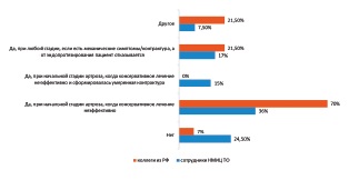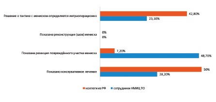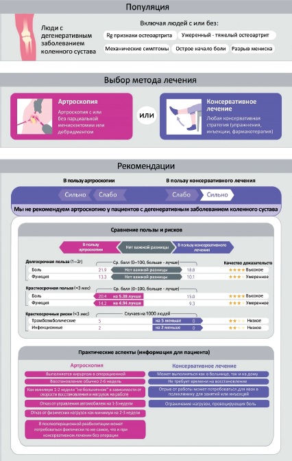 Results. More than patients with knee 2/3 OA of with degenerative meniscal tear benefit from non-surgical treatment therefore indication for arthroscopic partial meniscectomy is limited. The majority of current clinical guidelines consider surgery as an second option if conservative treatment failed and only for non-advanced knee OA. On the contrary experts interview demonstrated the lack of standardized approach as well as a lot of controversies in clinical decision making.