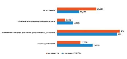 Background. For many decades arthroscopy considered to be the least invasive procedure among all surgical interventions for treatment of knee osteoarthritis (OA). In the beginning of XXI century several randomized clinical studies (RCS) demonstrated inefficiency of lavage and debridement for knee OA. The evidence regarding partial meniscectomy for this category of patients remained uncertain. Therefore the published clinical guidelines are either controversial or inconclusive.