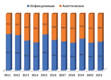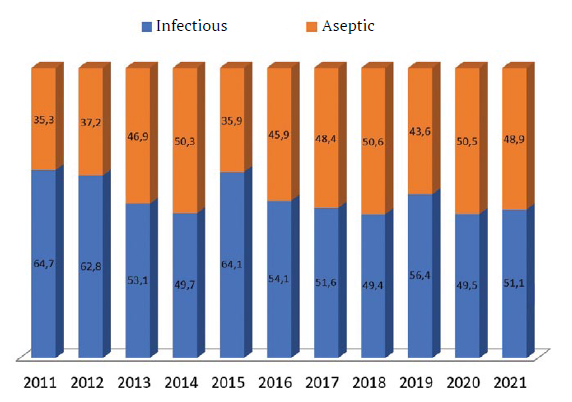When analyzing the knee joint arthroplasty registry of the Vreden National Medical Research Center of Traumatology and Orthopedics from 2011 to 2021, a trend towards equalizing the percentage ratio of aseptic and infectious revisions is observed (Fig. 1). This is likely due to a learning curve and the resulting gradual reduction in risks, namely intraoperative blood loss and time of primary operative intervention. However, these data are difficult to extrapolate to other clinics, as in this case, the Vreden National Medical Research Center of Traumatology and Orthopedics serves as a revision center, to which a large proportion of specialized patients from all regions of the Russian Federation are referred, regardless of the place of primary arthroplasty.