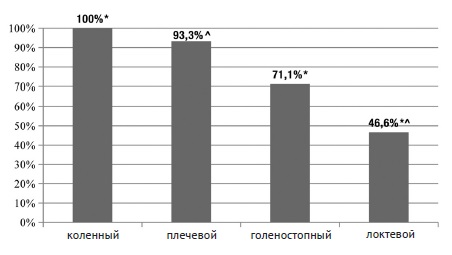 Рис. 1. Частота выполнения артроскопических операций в зависимости от сустава. Итоговый процент превышает 100, т.к. вопрос предполагал несколько вариантов ответа; p = 0,008; *vs^— p<0,008