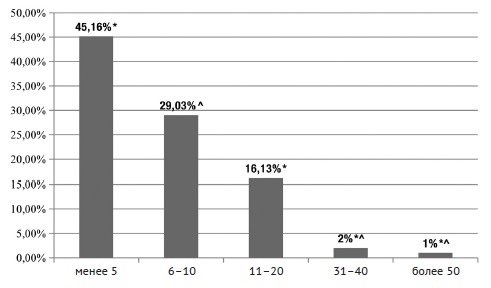 Рис. 3. Распределение респондентов по количеству проводимых артроскопических операций на тазобедренном суставе в год. Уровень значимости p = 0,005; *vs^ — p<0,005