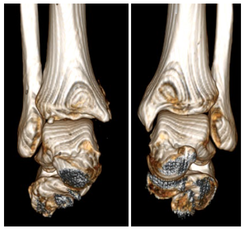 Fig. 2. CT scans of both ankle joints after primary surgical debridement