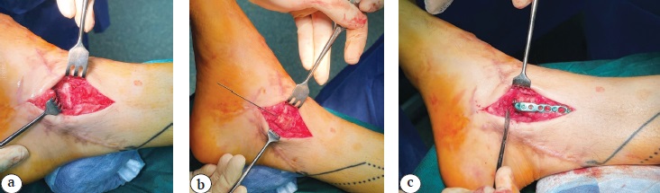 Fig. 5. Surgery stages: a — medial surface of the talar bone in the wound; b — autograft implantation in the medial ankle bed; c — autograft fixation with plate and screws