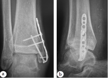 Fig. 6. Control X-rays after bone autoplasty and fixation with cancellous screw and plate: a — AP view; b — lateral view