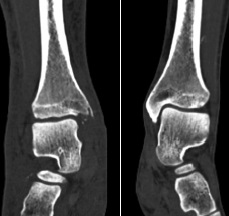 Twelve months after the surgery, the patient underwent CT of the ankle joint to assess the status of the graft and the condition of the ankle joint. CT scans showed complete consolidation of the graft and no signs of implant migration. There were also no signs of progression of degenerative changes in the ankle joint, which may attest to adequate biomechanics of the joint. Donor site was asymptomatic. AOFAS score was 93 points, range of motions in the ankle joint was 10-0-45°.