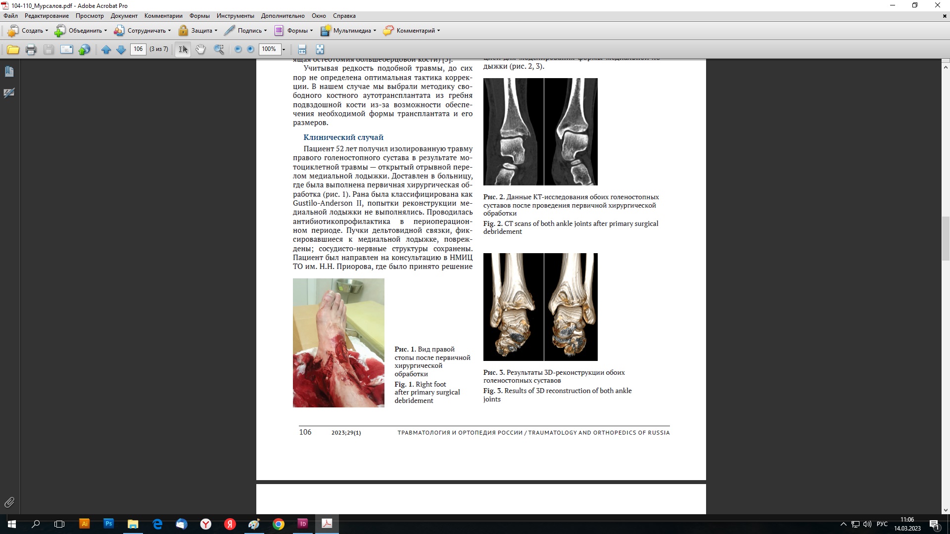 An article by M.I. Boyer et al. was published in 1994, describing the results of surgical treatment of an open avulsion fracture of the medial malleolus in an 18-year-old patient. The extent of bone damage was significantly less than in the case we presented. Clinically, the patient had medial ankle instability due to complete rupture of the deltoid ligament and a soft tissue defect 6×8 cm above the medial malleolus. Deltoid ligament reconstruction with the tendon of the plantaris muscle of the contralateral limb, tenodesis of the tendon of the posterior tibialis muscle to the medial surface of the talus and coverage of the soft tissue defect with a free flap of the gracilis muscle of the femur were performed. Thirty months after the surgery, the function of the ankle joint was restored [7].