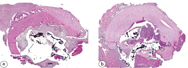 Fig. 6. The cross sections of femur at the defect level (Kelvin group): а — after 3 weeks; b — after 6 weeks. Staining with hematoxylin and eosin. Mag. ×20