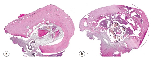 The samples were fixed in 10% neutral buffered formalin for 24-48 h. After this time, the materials were decalcified in 25% neutral Trilon B solution at room temperature on an Orbital Shaker OS20 machine (Biosan, Latvia). After decalcification according to the standard procedure, the materials were washed in distilled water. Then histological processing and embedding were performed. Next, we made 3-4 µm thick cross sections of paraffin blocks and stained them with hematoxylin and eosin.