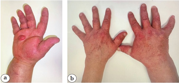 Patient (45 years old, height 163, weight 69, BMI 25), first contacted the consulting and diagnostic department of the Vreden National Medical Research Center of Traumatology and Orthopedics on 15.06.2022 complaining of a lump on the palmar surface of the right hand with periodic spontaneous discharge in the form of “rice grains”. Limb swelling had been observed since 2014, and the patient attributed the swelling to an injury caused by repeated blows on a glass door with his right hand. He did not seek medical care and did not receive conservative or surgical treatment. Since April 2022 the above mentioned symptoms began to bother him, so that the patient applied to the City Clinical Oncology Center, from which he was referred with the diagnosis of a synovial cyst of the right hand for further examination and consultation to the Vreden National Medical Research Center of Traumatology and Orthopedics, where he was routinely admitted and treated from 20.09.2022 to 03.10.2022.