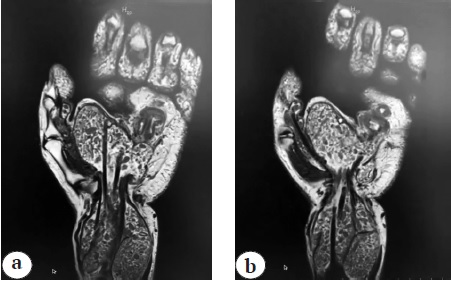 Fig. 2. MRI scans of right upper extremity: a — masses on the volar surface of the hand and wrist joint with multiple chondromal bodies, «rice grains» inclusions; b — peritendinal synovial cyst, located subcutaneously in the IV ray area, communicating with the flexor channels