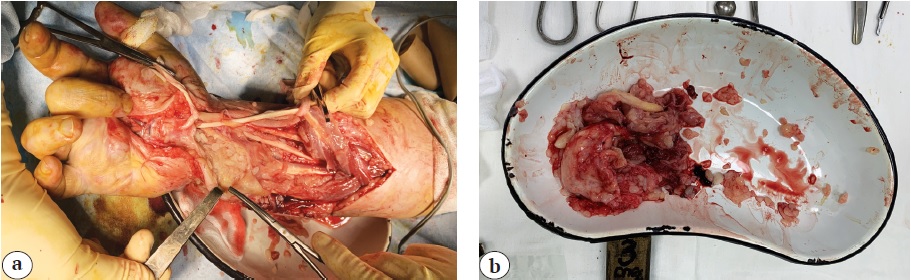 Fig. 3. The limb after fasciotomy of the anterior and lateral muscle compartments (a); removed abnormal tissues — hypertrophic synovial sheath, grain-like structures of various sizes in large numbers (b)