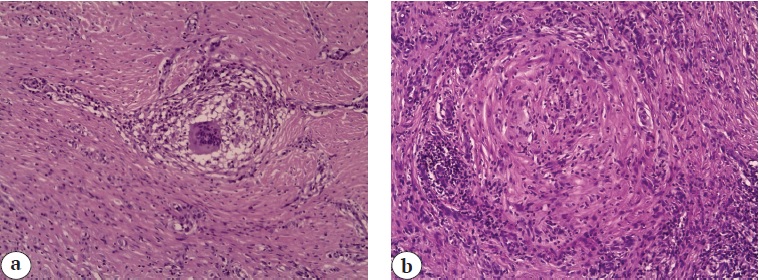Fig. 4. Histological specimens of soft tissue fragments: a — cell-free foci of hyalinosis are located in loose areolar tissue richly infiltrated by lymphocytes; b — multiple foci of hyalinosis with caseous necrosis surrounded by a bank of lymphocytes with rare multinucleated giant cells. Hematoxylin and eosin staining. Mag. ×280