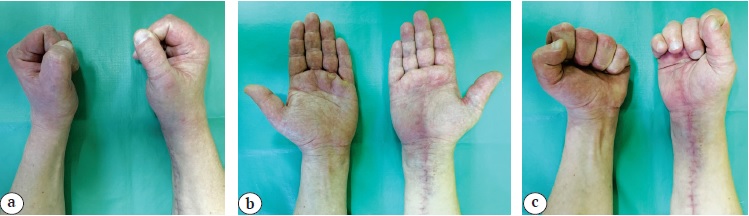 Fig. 5. Results 2.5 months after surgical treatment: a — maximal range of flexion in the finger joints of both hands, sagittal view; b — maximal range of extension in the finger joints of both hands; с — maximal range of flexion in the finger joints of both hands, frontal view