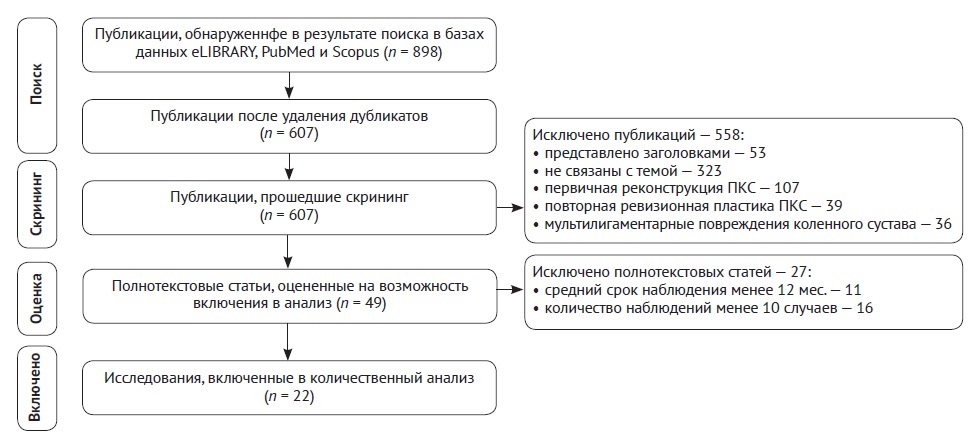 Methods. Information search was performed in the eLIBRARY, PubMed, and Scopus databases for the period from 2013 to 2022. Studies describing the main aspects of revision ACL reconstruction were selected for analysis. Inclusion criteria were the following: mean patient follow-up period of no less than 12 months, number of observations of no less than 10 cases. After evaluation of 898 articles, 22 articles were included in the systematic review.