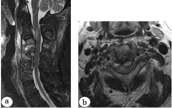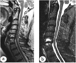 2. Fig. 1. MRI (a — T2 images; b — STIR images): C3–С7 polysegmental degenerative changes, spinal canal stenosis, C6–С7 end plates oedema type I Modic, polysegmental myelopathy C4–С7