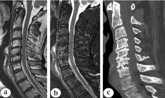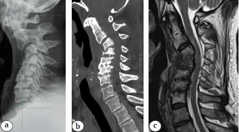 5. Fig. 4. X–ray (a), CT (b) and MRI (c) at the time of hospital admission: angular kyphosis 48° Cobb, destruction of C3–С5, myelopathy at C2–С3, no signs of active inflammatory process (abscesses)