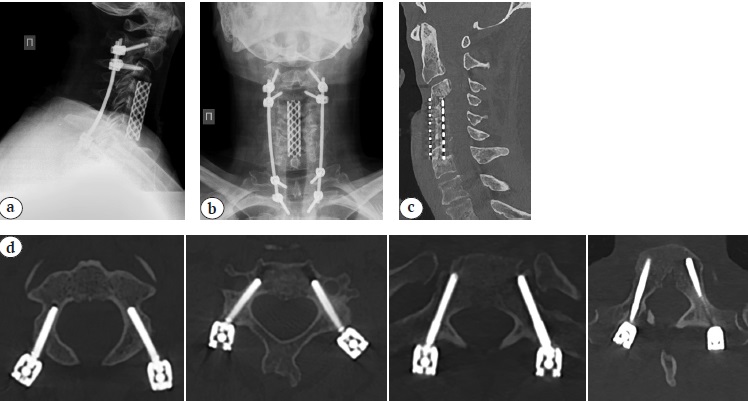 Fig. 5 (a, b, c, d). Sagittal (a) and frontal (b) X–rays, sagittal CT (c) 10 months after surgery: posterior transpedicular screw fixation correct position, solid anterior fusion C3–C7 formation detected. (d) - Axial (d) CT: posterior transpedicular screw fication correct position, solid anterior fusion C3–C7 formation detected