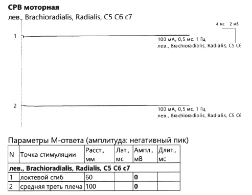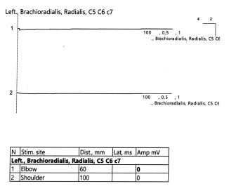 The patient provided an ultrasound examination report of the left radial nerve, which indicated signs of compression and integrity violation of the radial nerve in the lower third of the shoulder in the area of the blocking screw, as well as swelling of the radial nerve trunk. Electroneuromyography (ENMG), including stimulation at the Erb's point, revealed complete functional block of neural conduction along the radial nerve on the left side (Fig. 2).
