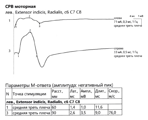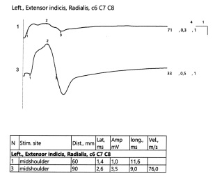 ENMG data showed significant positive dynamics, with a low-amplitude M-wave and increased chronodispersion from the extensor indicis muscle and low-amplitude sensory nerve action potential upon stimulation of the superficial radial nerve (Fig. 6).