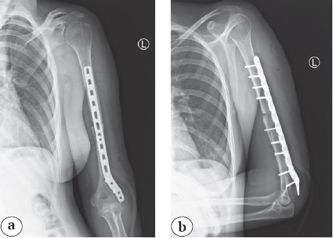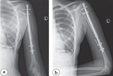 Fig. 4. X-rays after re-fixation of the left humeral bone with a plate; the position of the fragments and metal fixator is satisfactory: a — anteroposterior view; b — lateral view