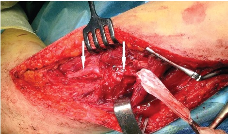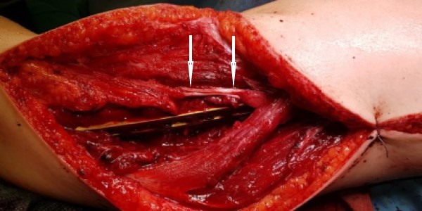 Fig. 3. Intraoperative photo: A break in the radial nerve is identified (indicated by arrows) in the projection of the distal blocking screw; a neuroma at the proximal cult of the nerve