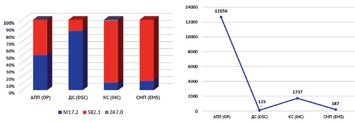 Methods. An anonymized sample was obtained from the region’s database, covering the period from 2017 to 2021, using the ICD-10 codes S82.1, Z47.0, M17.2, and M17.3. Data Science principles and software were applied for analysis.