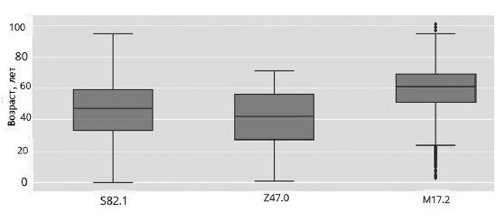 Различия в среднем возрасте в группах S82.1 и M17.2 были статистически значимыми (t = -49, df = 14 540; p<0,0001). Между группами S82.1 и Z47.0 статистически значимые отличия в среднем возрасте отсутствовали (t = 1, df = 73, p = 0,1). Во всех группах МКБ-10 средний возраст женщин превышал средний возраст мужчин: S82.1 : Z47.0 : M17.2 = 51,0±20,0(Ж), 39,0±18,0(М):49,0±16,0(Ж), 34,0±16,0(М):61,0±14,0(Ж), 54,0±17,0(М). Однако значимые отличия в среднем возрасте выявлены только в группе S82.1 (t = -29, df = 7888, p<2e-16) и M17.2 (t = -17, df = 3080, p<2e-16). Распределение пациентов по возрасту в зависимости от принадлежности к группе МКБ показаны рисунке 2.