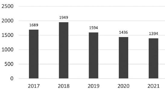 2017 | 1677 | 21 | 33 | 4 | 1309 | 2 | 343 | 35 | 5 | – | 2 | – | 3431 |