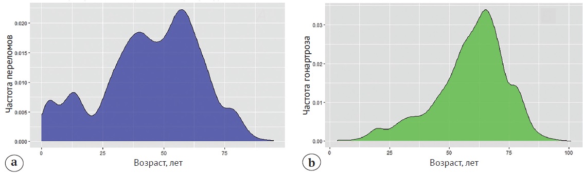 Рис. 4. Плотность распределения пациентов с переломами S82.1 (a) и гонартрозом M17.2 (b) по возрастным группам