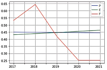 Fig. 5. Normalized data: P — population; E — elderly population; F — number of fractures in the elderly